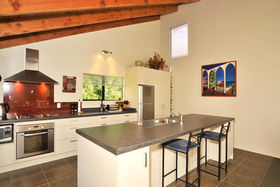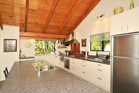 A spacious room at one end of the house, can be used as a utility room or has the ability also to serve as a living room with its own kitchenette allowing for guests to fare for themselves and also allowing them to use one wing of the house independently. A separate laundry has dual access and can be used by both guests and the property owner independently of each other.